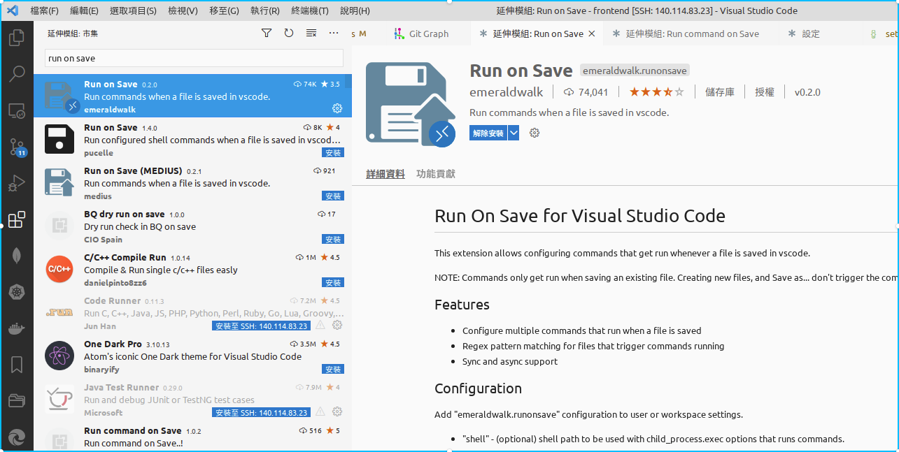 首先,在 VSCode 的擴充套件商店搜尋 run on save,找到作者是 emeraldwalk 的版本,進行安裝: