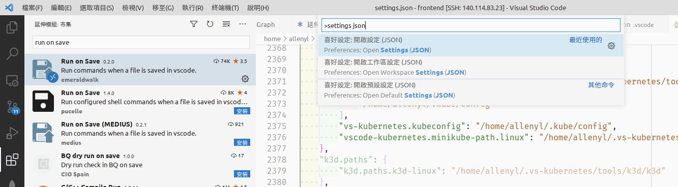 按下快捷鍵 ctrl+shift+p 跳出指令輸入欄,輸入 settings json 後,選第一個 Open settings (JSON) 按下 enter: