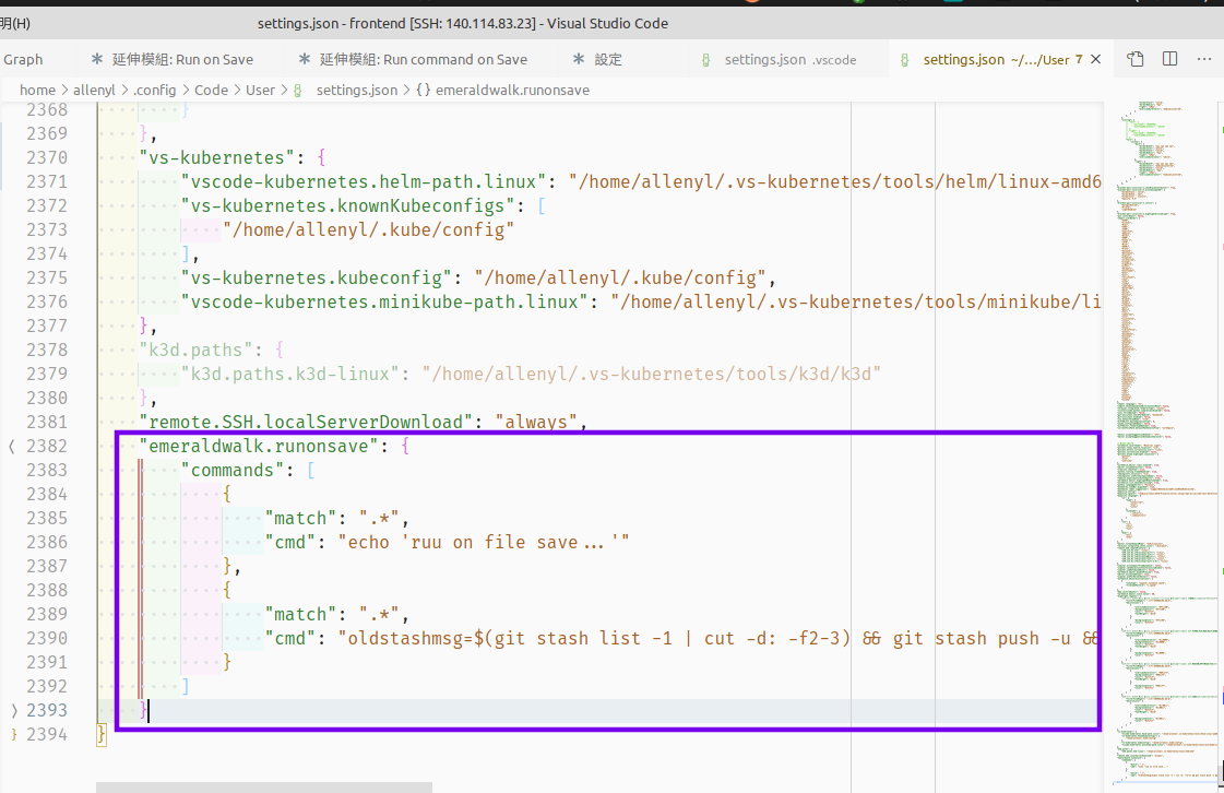 "cd \"${fileDirname}\" && lock=\"$(git rev-parse --git-dir)\"/runonsave.lock && if [ -n \"$(git status -s)\" ]; then if [ ! -f \"$lock\" ]; then touch \"$lock\" && git stash push -u && git stash apply --index --quiet && if [ -z \"$(diff <(git rev-parse stash@{1}~) <(git rev-parse stash@{0}~))\" ] && [ \"$(git diff --word-diff=porcelain stash@{1} stash@{0} -- . ':(exclude)*.ipynb' | grep -e '^+[^+]\\|^-[^-]' | wc -m)\" -lt 3000 ] && [ \"$(git diff --word-diff=porcelain stash@{1}^3 stash@{0}^3 | grep -e '^+[^+]\\|^-[^-]' | wc -m)\" -lt 3000 ];then git stash drop stash@{1} && rm \"$lock\"; else echo \"don't drop\" && rm \"$lock\"; fi; else echo \"locked!\"; fi; else echo \"No local changes to save\"; fi;"文字差異變化量增加為 3000,因為原本的 500 太小了,有點小修改就一直保留stash。