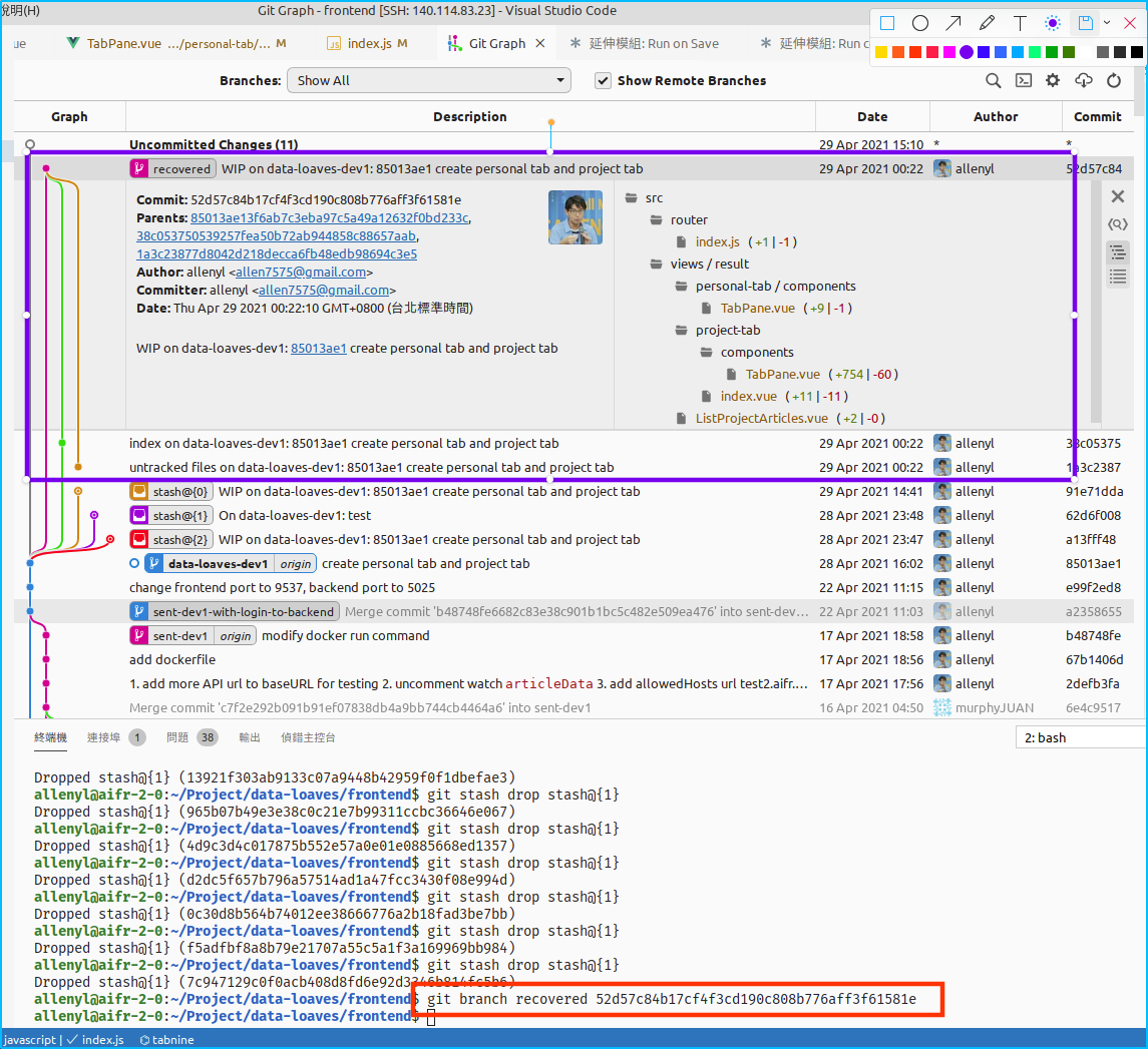 這會建立一個新 branch 名為 recovered 在已經移除的 stash 上,切換到該branch 就可將檔案取回來。